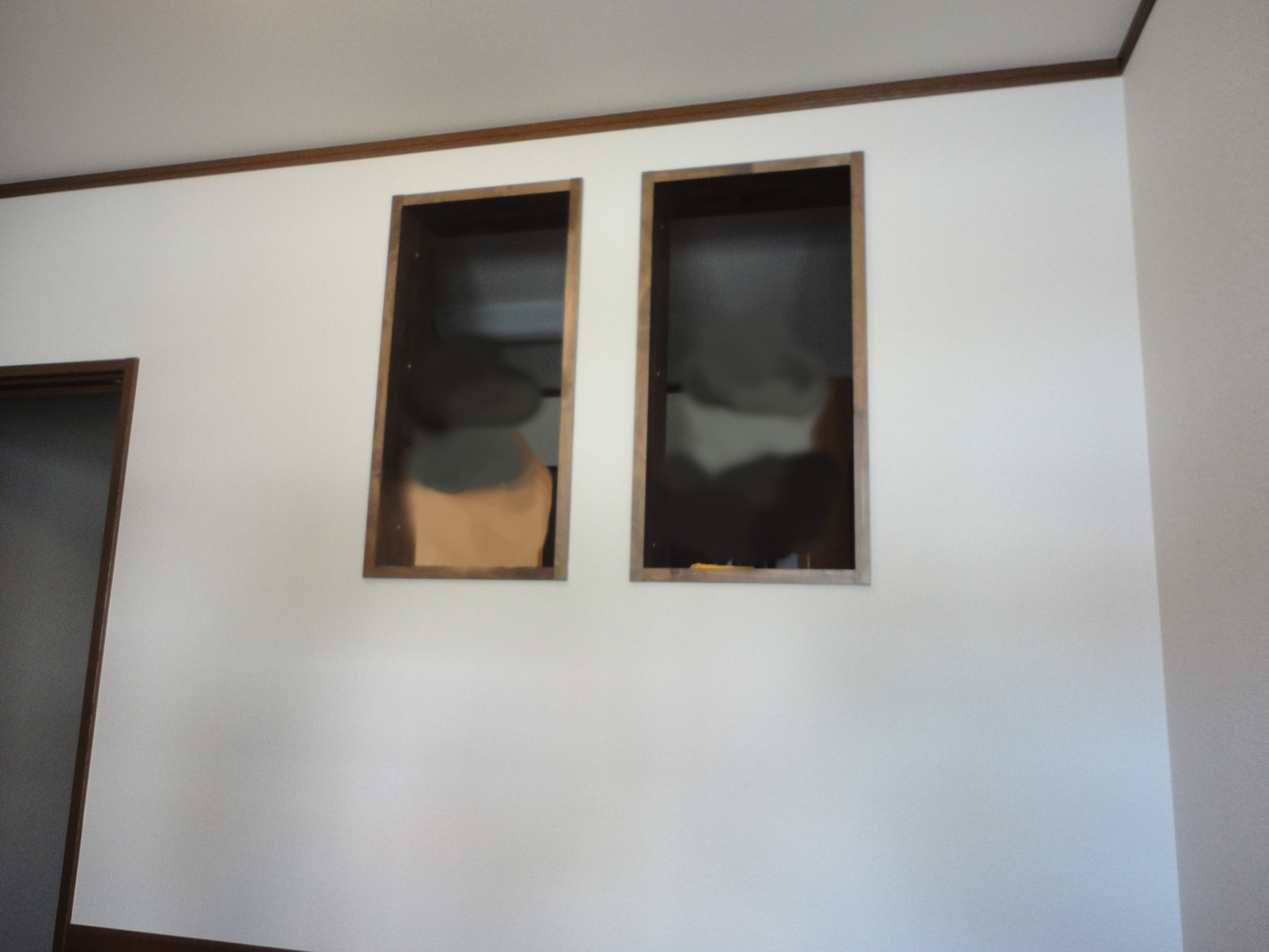 室内の壁に穴をあけて開放感を出したいとご依頼を頂きました。新設の窓枠は幅が調整できるように集成材で作成し、木目を生かすためオイルステインで色付けをしニスで仕上げております。