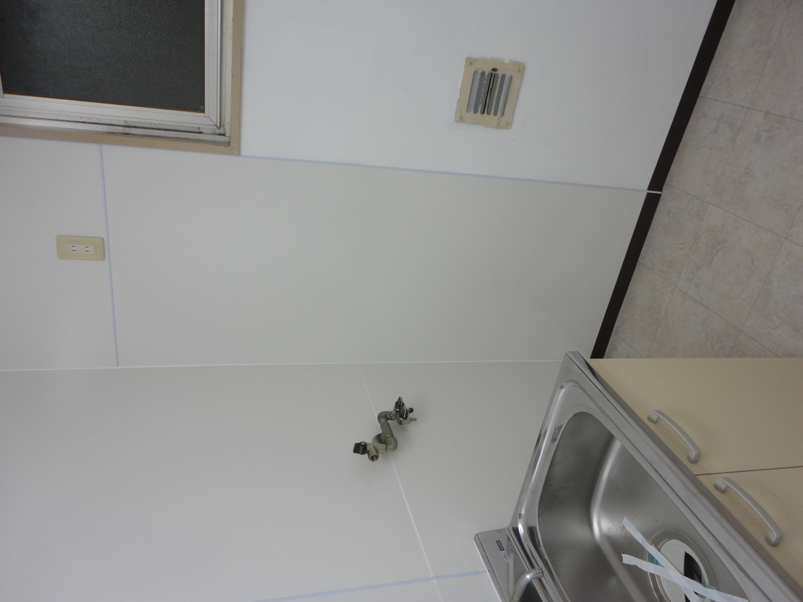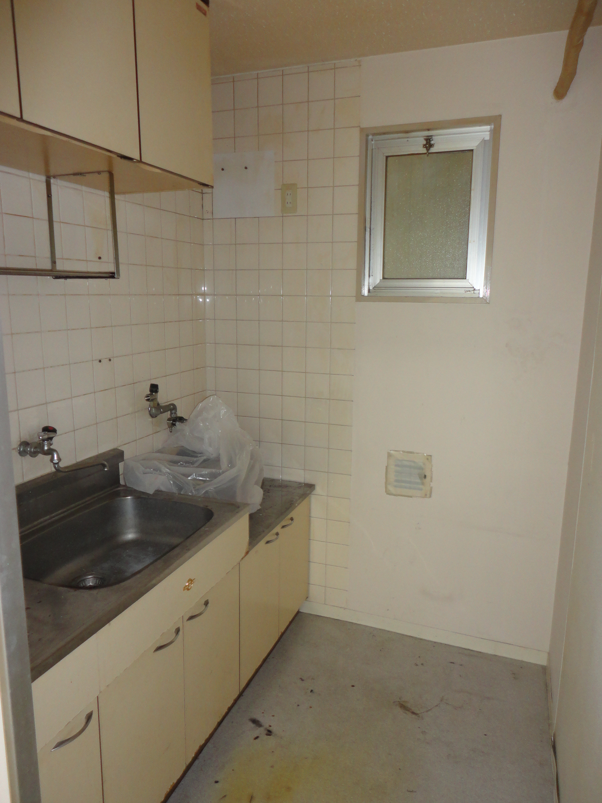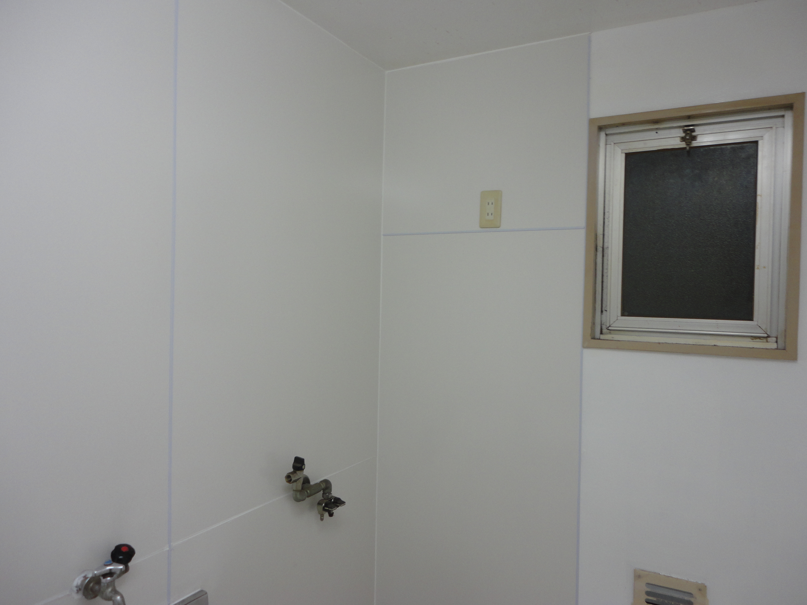 テナントビルで退去されたのできれいにしてほしいとご依頼を頂戴しました。給湯室をきれいにしたいとの事でしたので、壁にキッチンパネルを張るのをお勧めいたしました。タイルは目地などに汚れが溜まったりしますがキッチンパネルならサッと一拭き!本来ならガス管や水道管を外してきれいに仕上げるのが通常ですが、費用が掛かる為残した状態での施工となり見た目は美しくないですが機能は問題ありません。オーナー様にも大変お喜び頂き、すぐに新しい借主様が決まったとご報告を頂きました。何よりです。